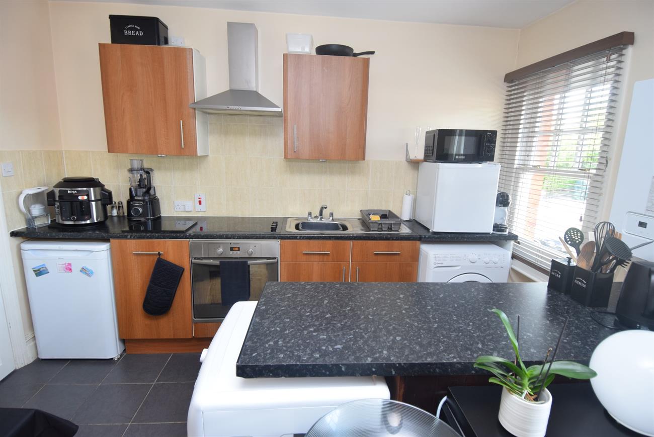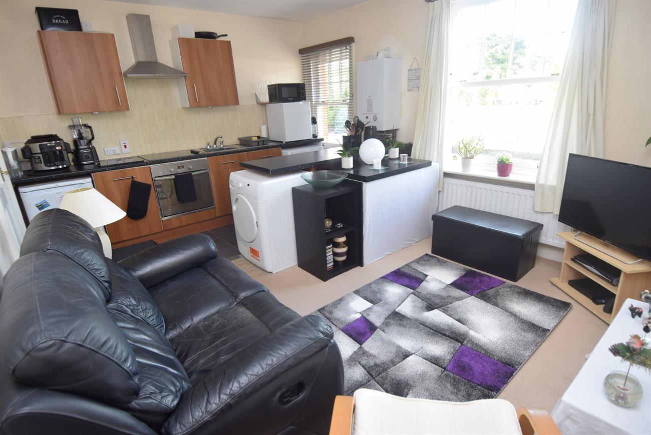 An open plan room with two windows to the front elevation. The kitchen area is fitted with a range of base and wall units, preparation work surfaces, single sink unit with mixer tap, fitted electric hob with cooker hood over, built-in electric oven, plumbing for washing machine and gas fired boiler, radiator.