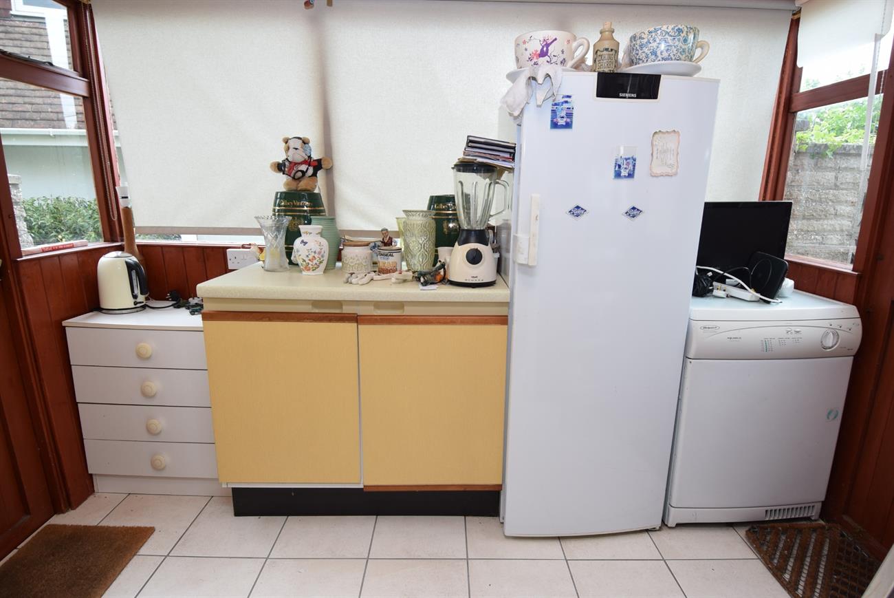 Base and wall units, preparation work surfaces, stainless steel one and a half bowl sink unit, integrated washing machine, dishwasher and fridge, double oven, electric hob with cooker hood over, shelved storage cupboard, double glazed window to the rear and two windows to the side elevation, door giving access to the side garden room/utility and door to the conservatory.