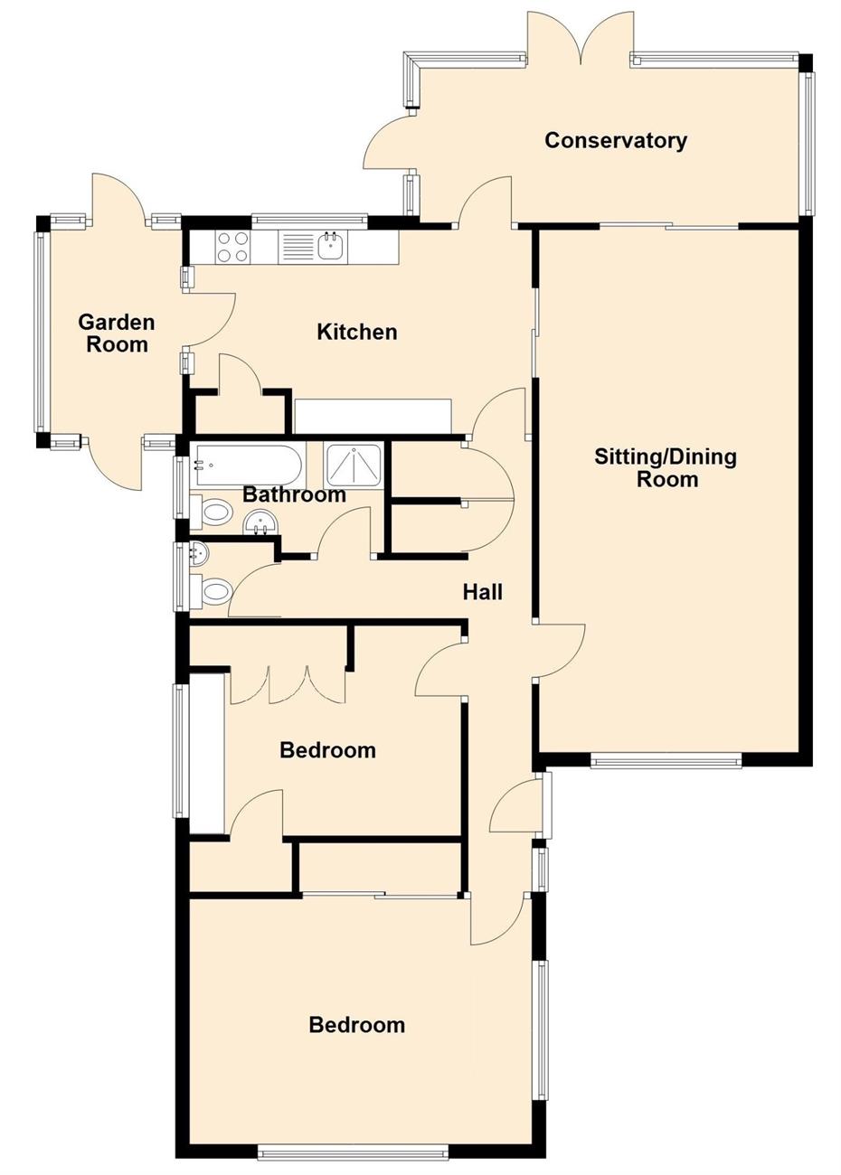 Windows and doors to the front and rear elevation, windows to the side elevation, base units with worktop.