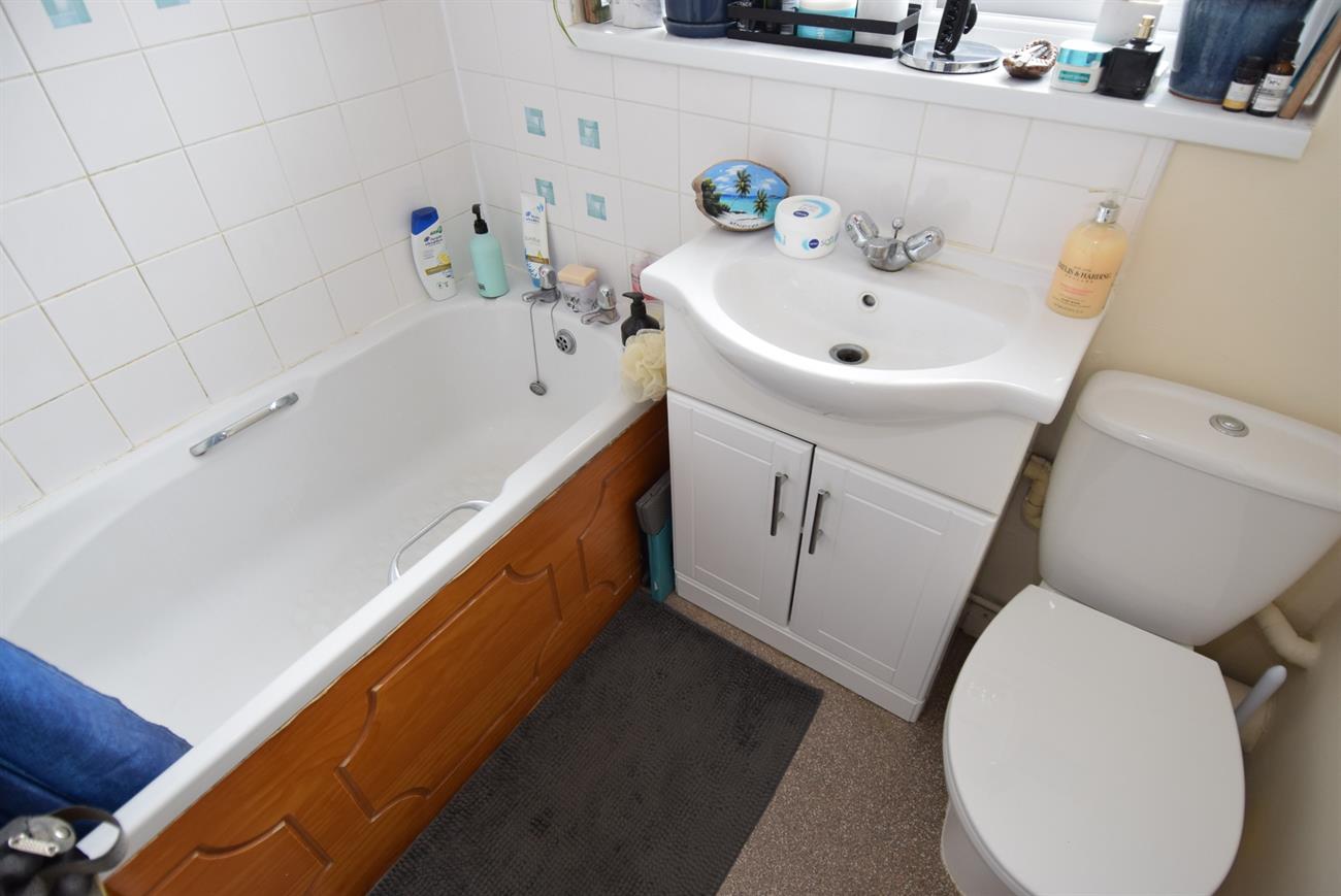 Comprising of bath with Triton shower over, wash hand basin with mixer tap set in vanity style unit, W.C., window, heated towel rail.