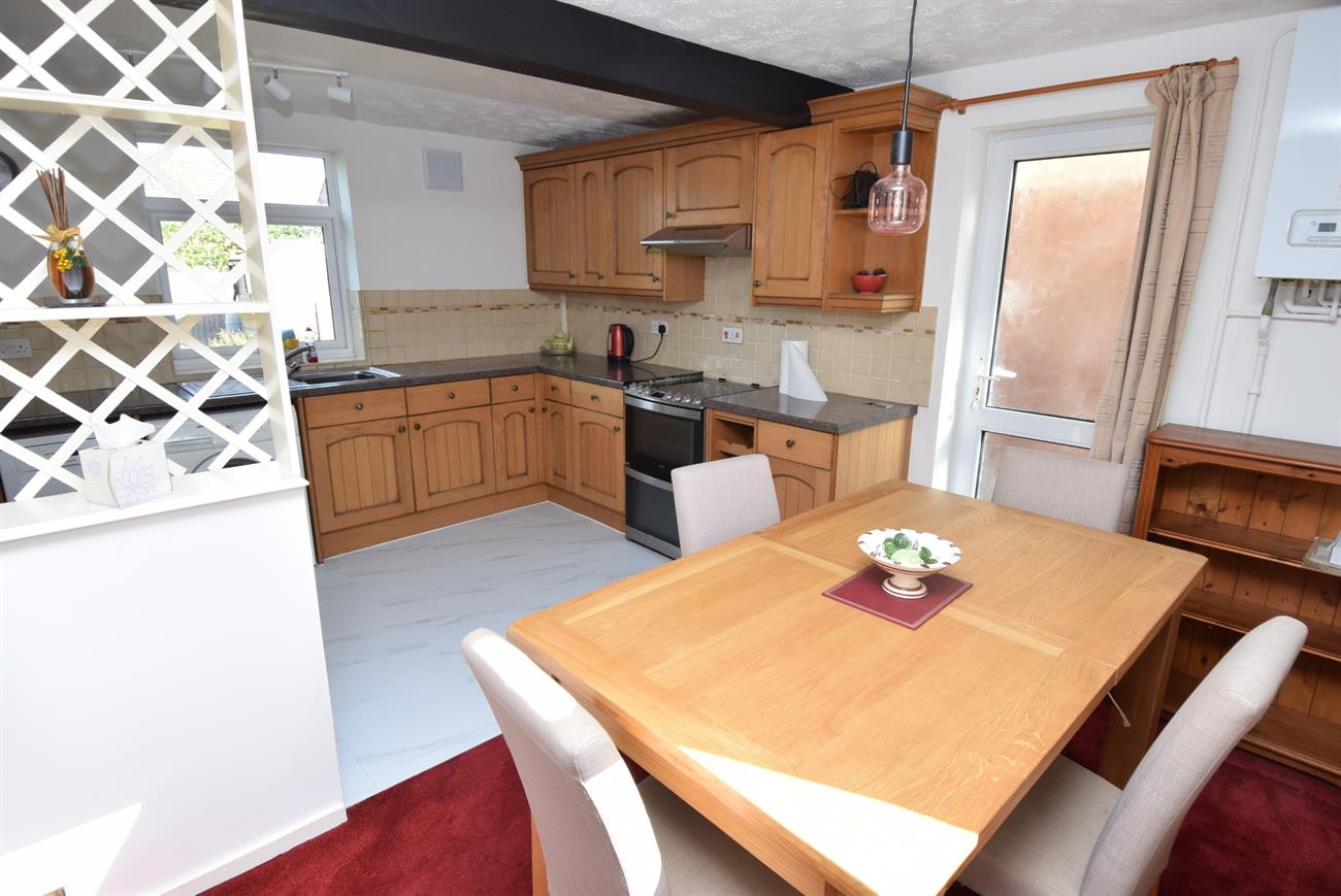 A dual aspect room with window to the front elevation and window to the rear elevation, radiator, wall mounted gas fired boiler, stairs rising to the first floor, under stairs storage cupboard. The kitchen area has a range of base and wall units, preparation work surfaces, stainless steel sink unit with mixer tap, plumbing for washing machine, cooker hood.