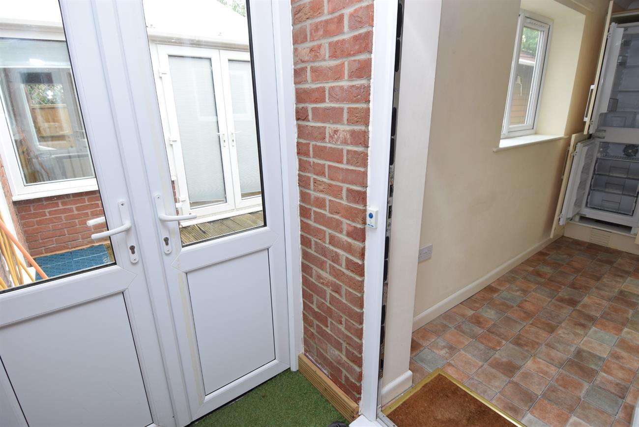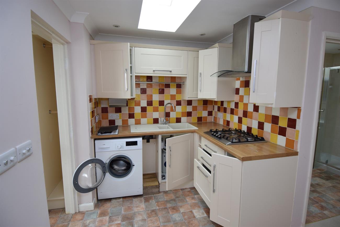 Fitted with a range of base, drawer and wall units, preparation work surfaces, integrated fridge/freezer, fitted gas hob with cooker hood over, built-in oven, plumbing for washing machine, one and a half bowl sink unit with mixer tap, radiator, window to the rear elevation, door giving access to the rear garden.