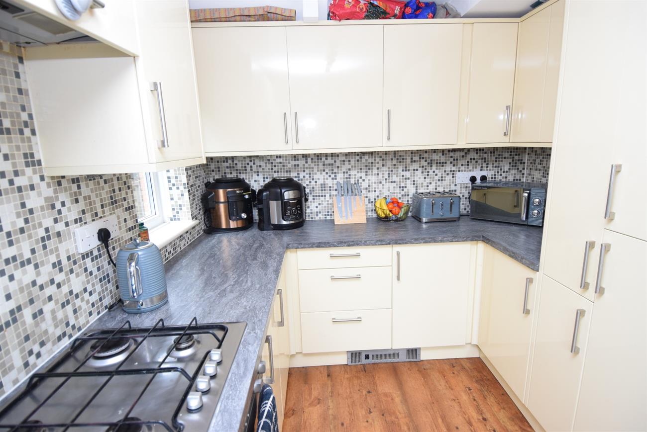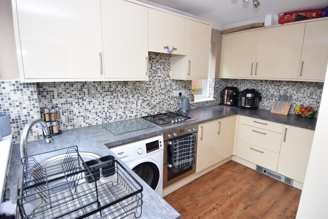 Fitted with a range of base, drawer and wall units, preparation work surfaces, integrated fridge/freezer, fitted gas hob with cooker hood over, built-in electric oven and grill, circular stainless steel sink and drainer with mixer tap, plumbing for washing machine, window to the rear elevation, window to the side elevation, door giving access to the rear garden.