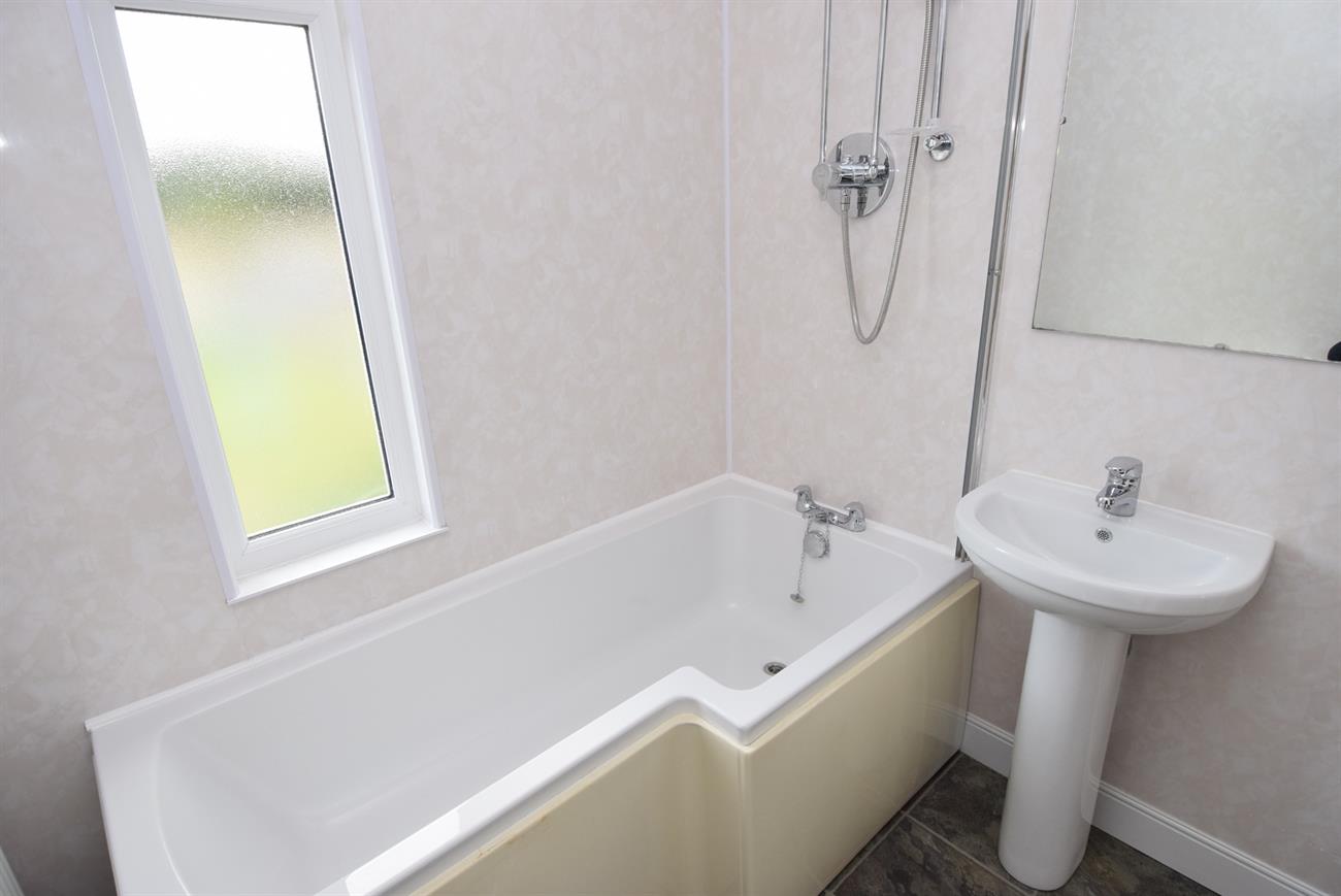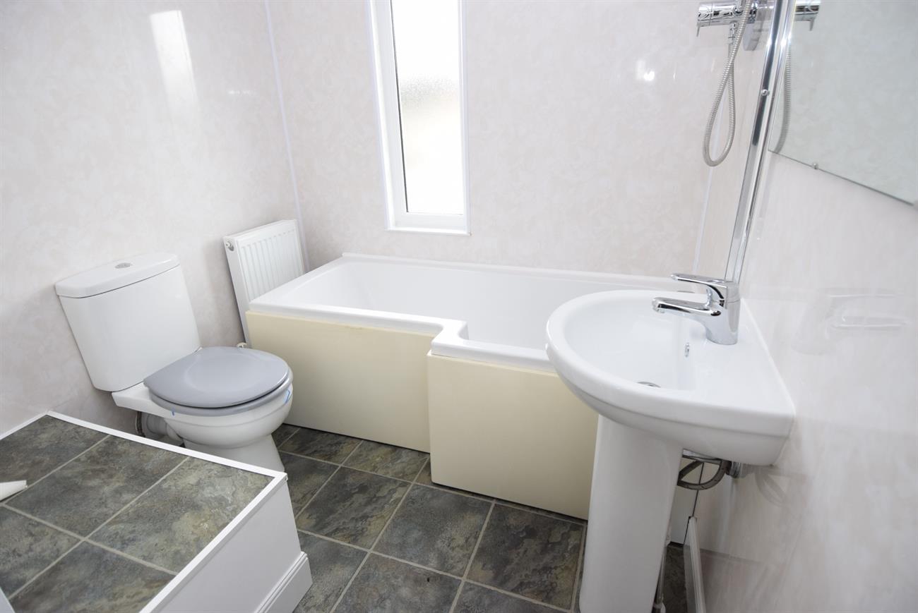 Window to the rear elevation, P shape bath with mixer tap and shower over, WC, wash hand basin, extractor fan, radiator.