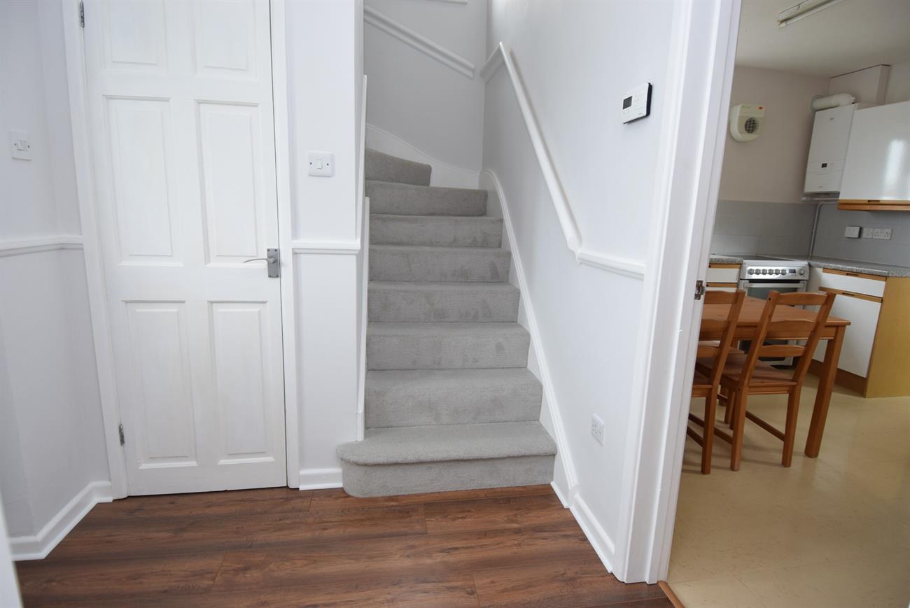 Stairs rising to the first floor, radiator, generous size walk-in cupboard with plumbing for washing machine, window and light and power.