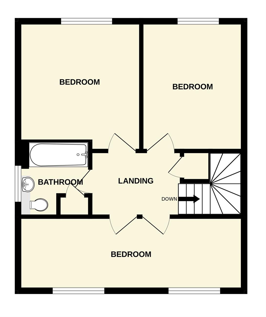 Comprising of bath with mixer tap and shower attachment, Triton shower over and shower screen, concealed cistern W.C., wash hand basin with mixer tap set in vanity style unit, ladder rack style radiator, window, airing cupboard housing hot water cylinder and slatted shelving.