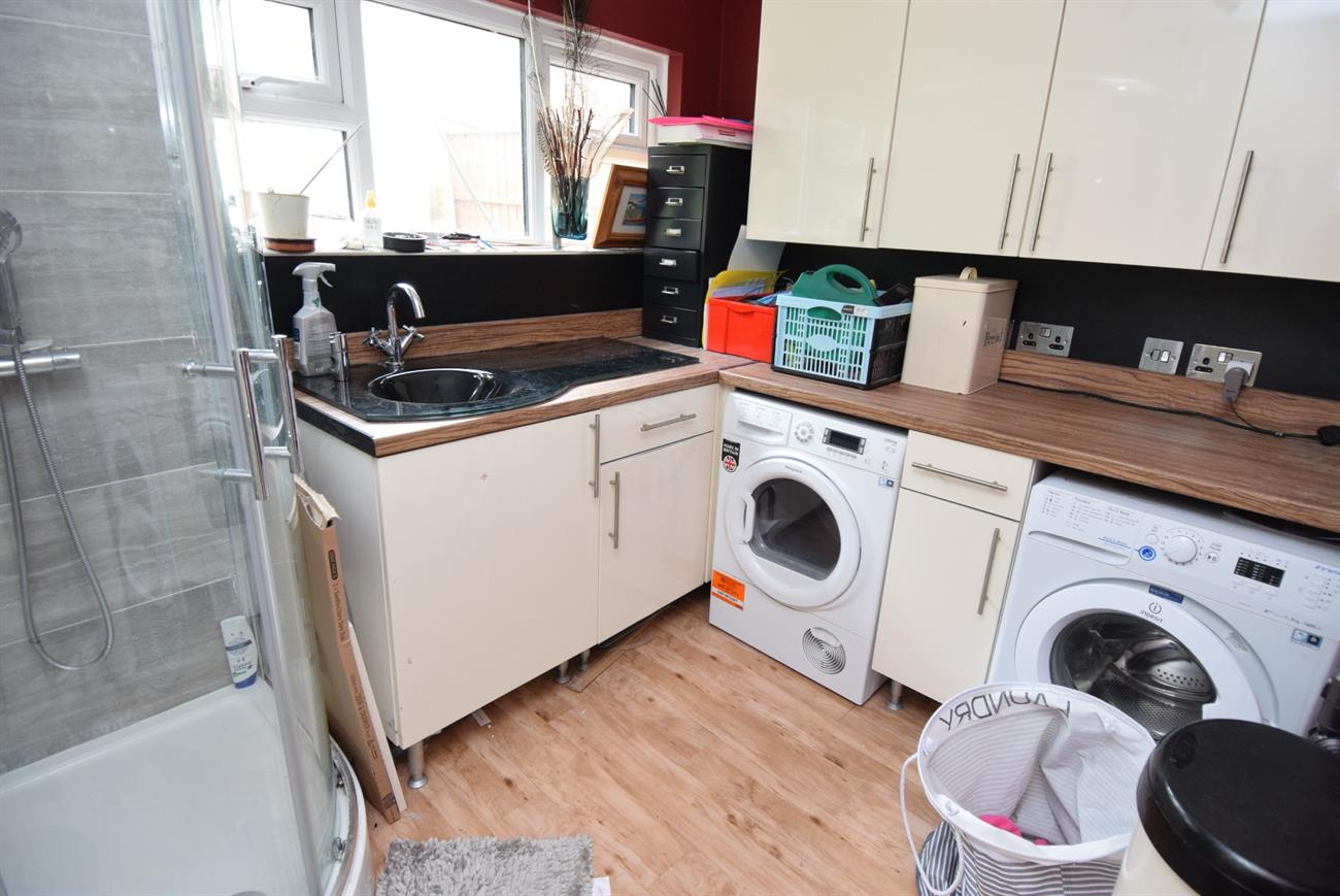 Fitted base and wall units with work surfaces over, stainless steel sink unit, plumbing for washing machine, space for tumble dryer, shower cubicle, towel rail radiator, window to the rear elevation.