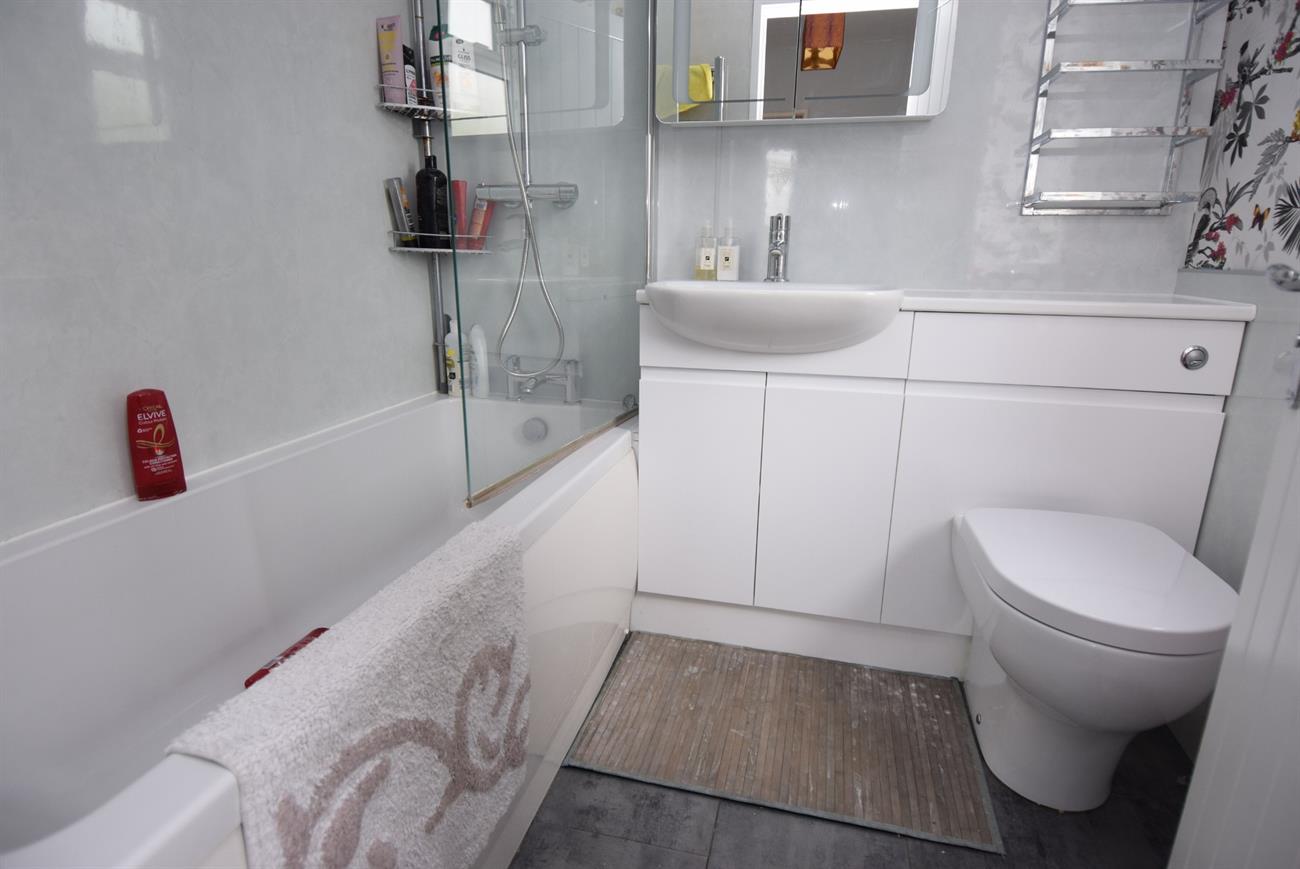Comprising of bath with mixer tap and shower over, vanity style wash hand basin with concealed cistern W.C., window, radiator, heated towel rail.