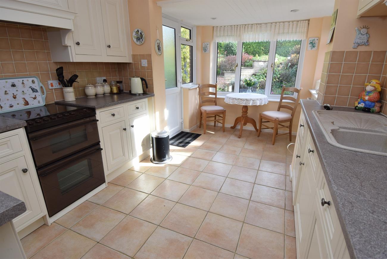 Fitted with a range of base and wall units, preparation work surfaces, one and half bowl sink unit with mixer tap, freestanding cooker with cooker hood over, integrated washing machine and fridge, oil fired boiler, radiator, windows to both sides and rear elevation, door to the rear garden.