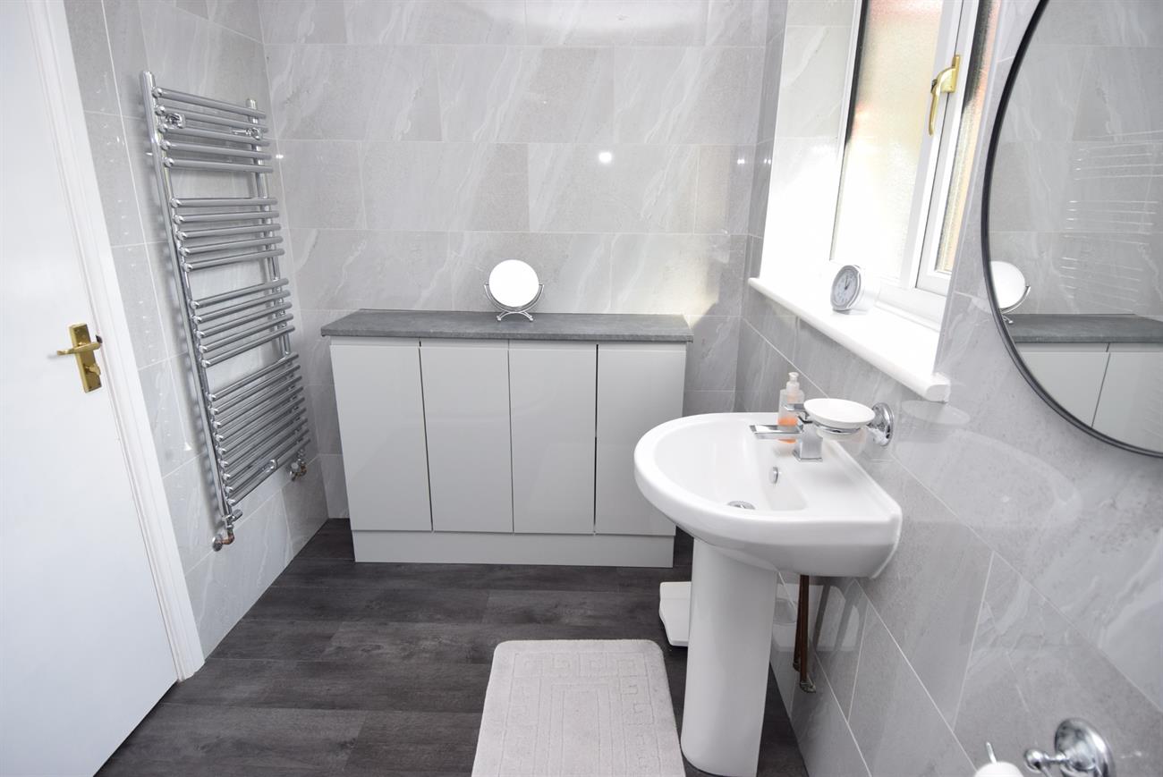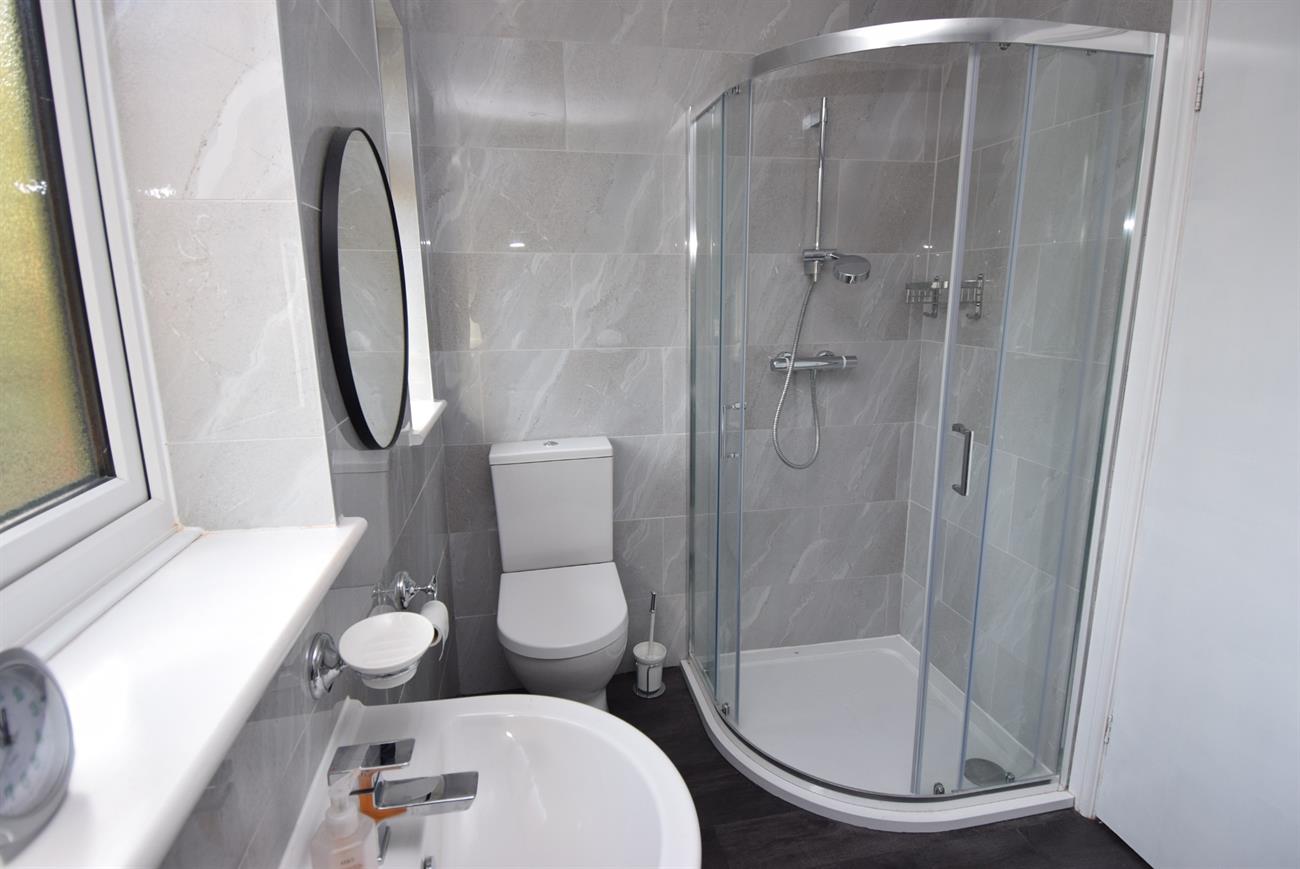 Fully tiled walls, corner shower cubicle, wash hand basin with mixer tap, W.C., vanity unit, two windows, ladder rack style radiator.