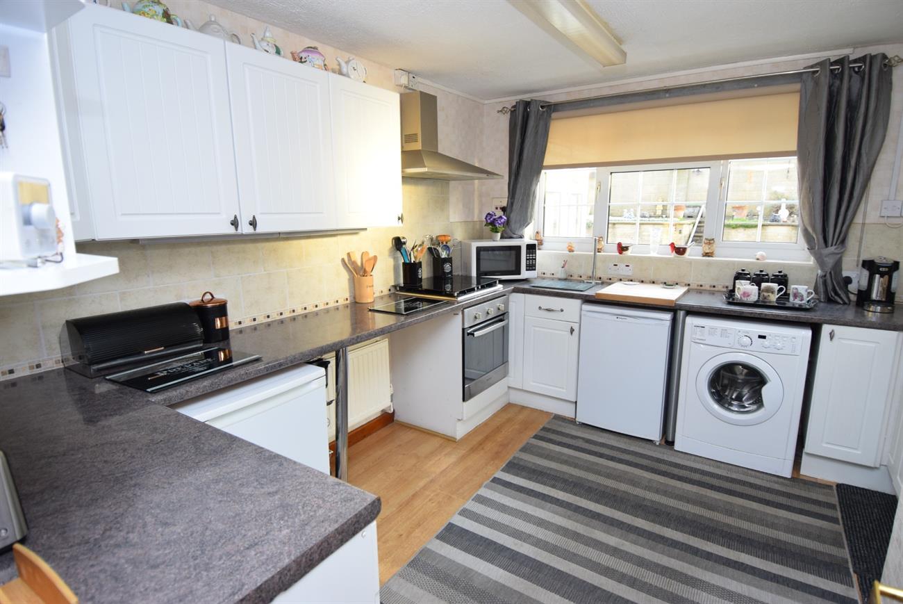 Fitted with a range of base and wall units, preparation work surfaces, fitted gas hob with cooker hood over, built-in electric oven, stainless steel one and half bowl sink unit with mixer tap, plumbing for washing, radiator, storage cupboard, window to the rear elevation, window to the side elevation, door giving access to the rear porch with door leading to the rear garden.