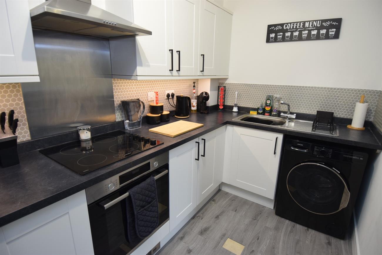 A very attractive fitted kitchen with a range of wall and base units with preparation work surfaces, single drainer stainless steel sink unit with mixer tap, built-in oven and hob with cooker hood over, plumbing for washing machine, spot lighting and concealed lighting, plinth heater.