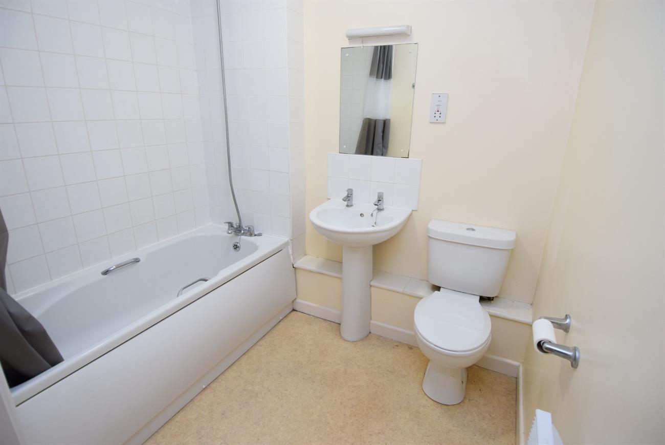 With white suite comprising of panelled bath with shower attachment, wash hand basin, W.C., Dimplex electric heater.