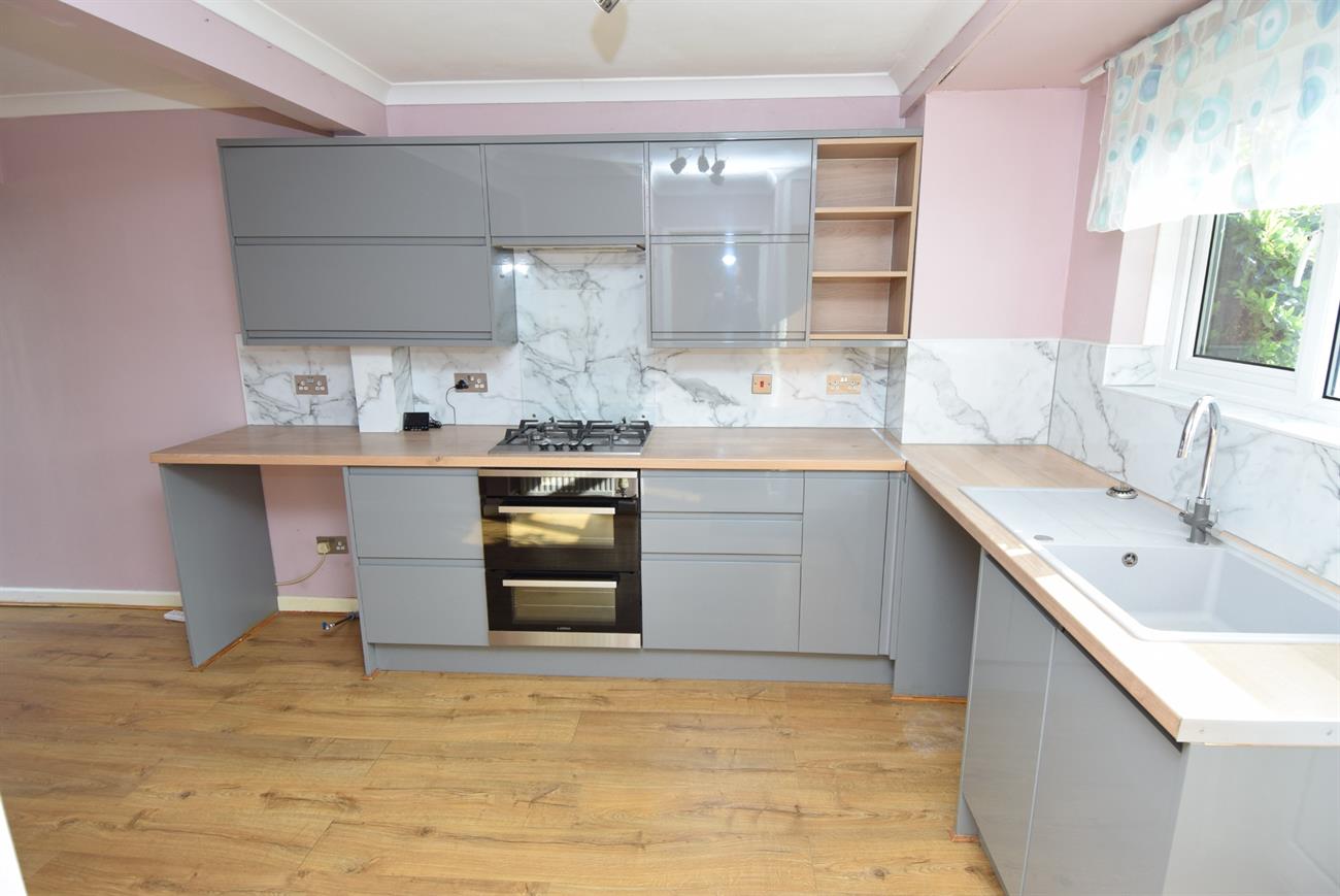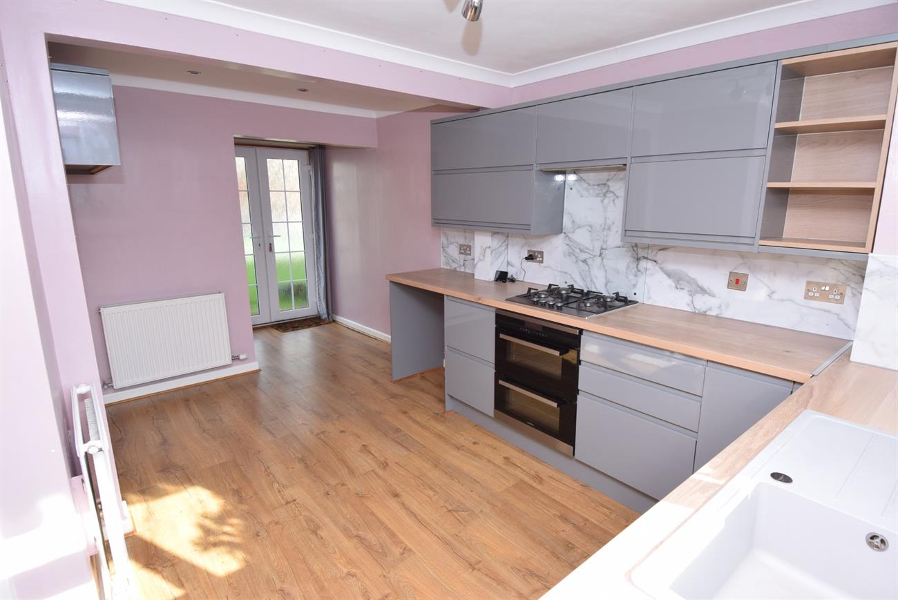 Fitted with a range of base, drawer and wall units, preparation work surfaces, sink unit with mixer tap, fitted gas hob with cooker hood over, built-in electric double oven and grill, plumbing for washing machine, three built-in storage cupboards, French Doors giving access to the front of the house, window to the rear elevation, radiator.