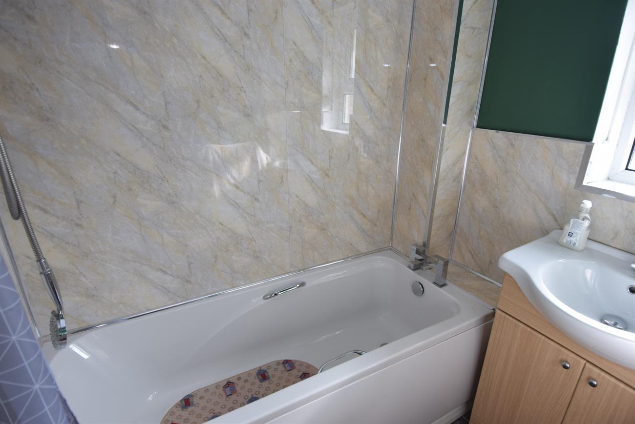 Comprising of bath with mixer tap and shower over, wash hand basin set in vanity style unit, ladder rack style radiator, window.