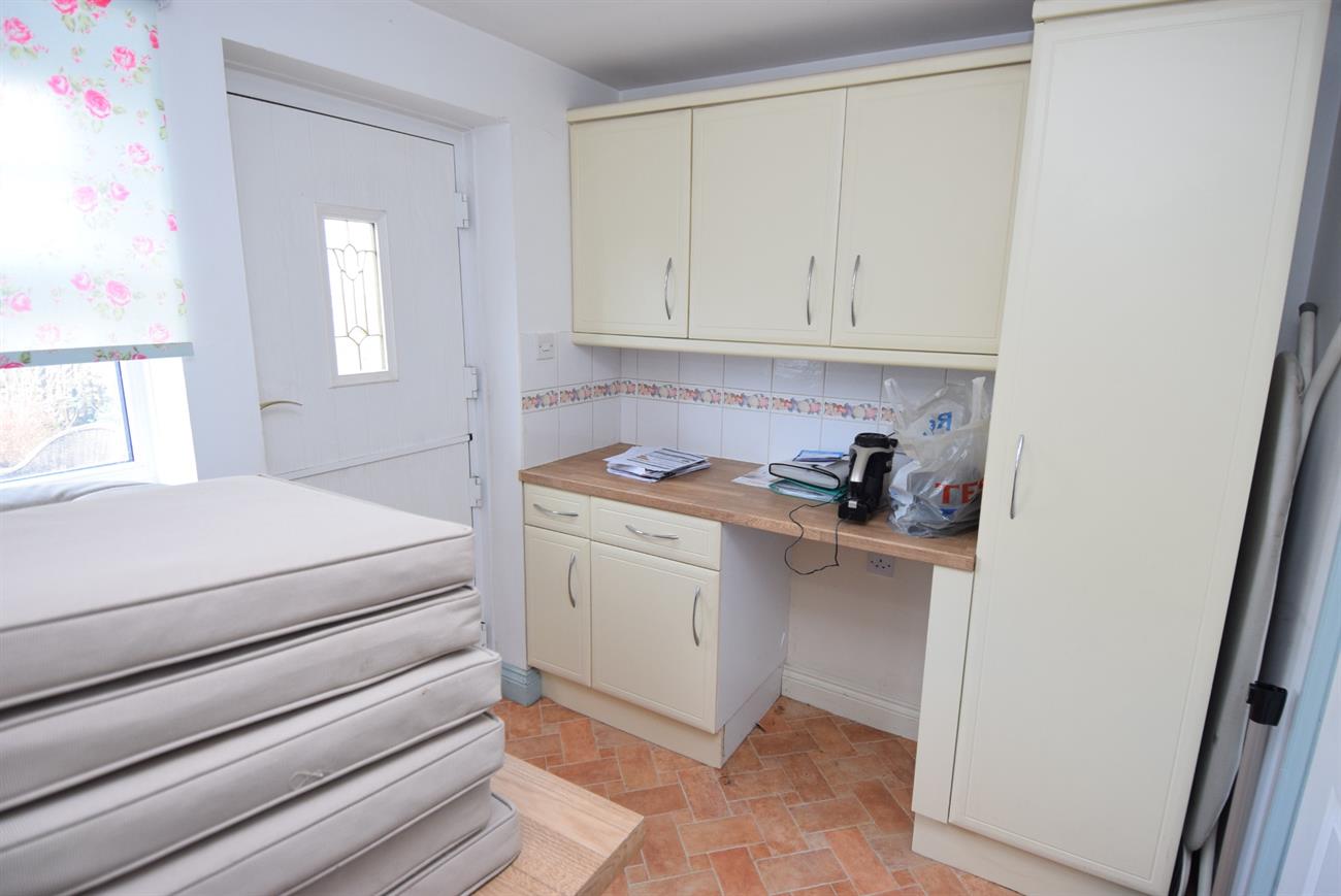 Base and wall units, work surface, stable door giving access to the rear garden, plumbing for washing machine, radiator, door to the garage, window to the rear elevation.