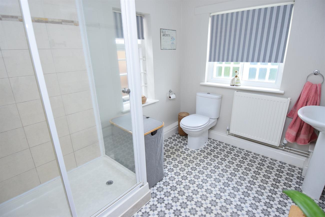 Comprising of double shower, W.C., wash hand basin, ladder rack style radiator, two windows.