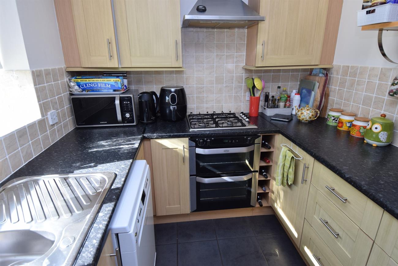 Fitted with a range of base and wall units, preparation work surfaces, stainless steel sink unit with mixer tap, fitted gas hob with cooker hood over, built-in electric oven and grill, plumbing for both dishwasher and washing machine, window.