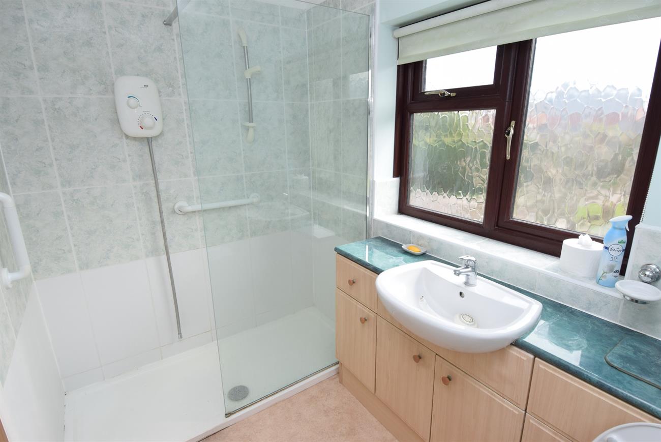 Comprising of double walk-in shower tray with Mira shower unit and screen, wash hand basin set in vanity style unit, concealed cistern W.C., window, ladder rack style radiator.