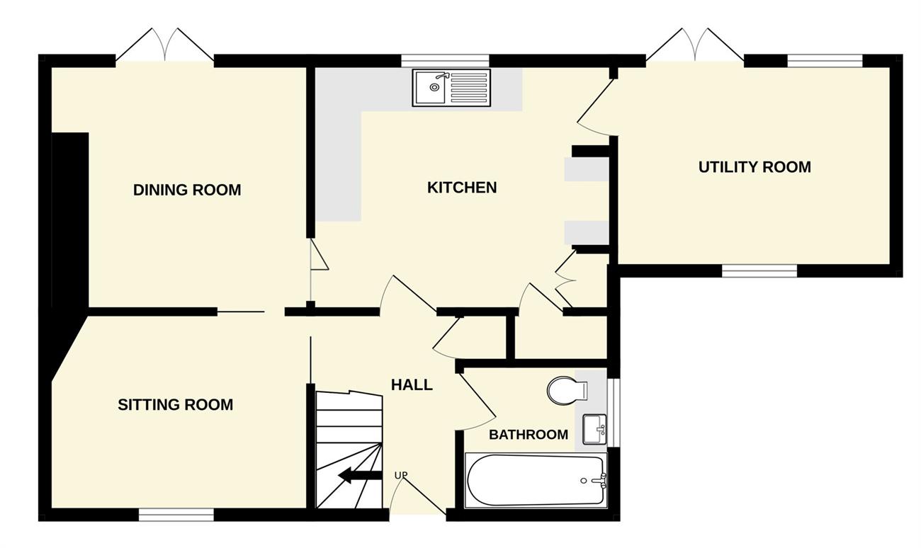 Sink unit, plumbing for washing machine, wall mounted Worcester gas fired boiler, window to the front elevation, French Doors giving access to the rear garden, window to the rear elevation.