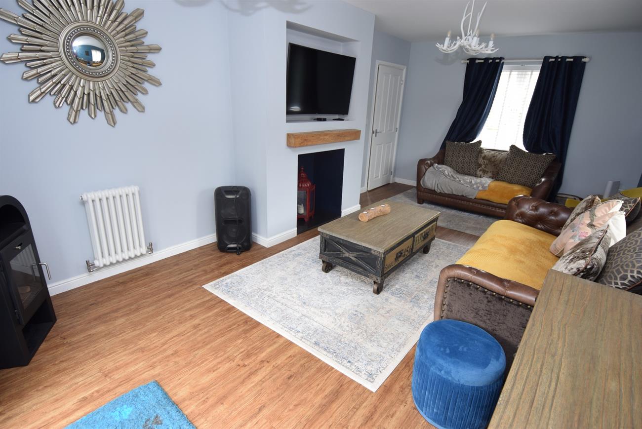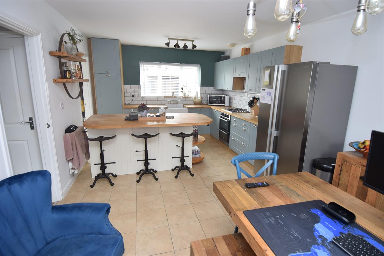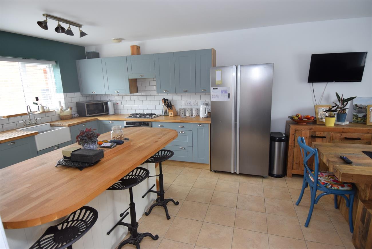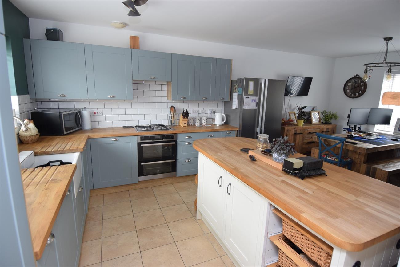 Dual aspect room with windows giving views to the front and rear of the property. The attractive re-fitted kitchen has a range of base and wall mounted units with soild oak preparation work surfaces, Belfast style sink with mixer tap, built- in oven and hob with cooker hood over, centre island with breakfast bar, tiled floor, plumbing for dishwasher, radiator.