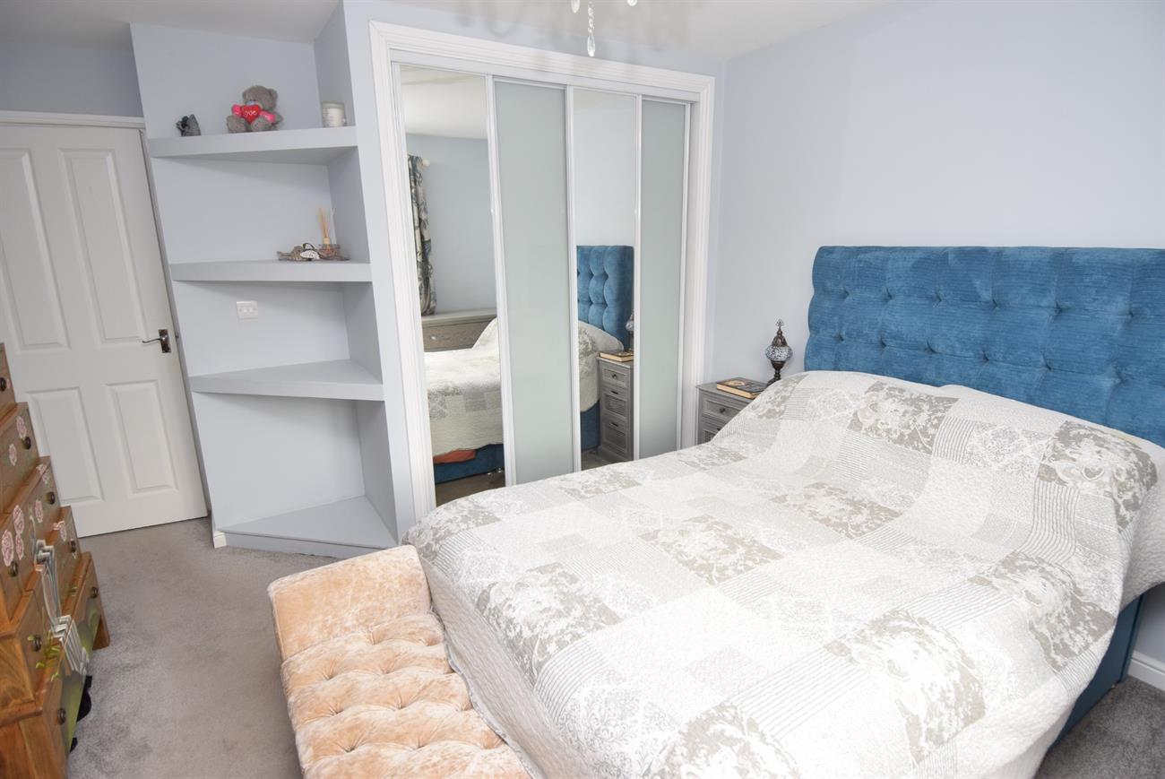 With built-in mirror fronted wardrobe, radiator, display shelving, window to the rear elevation.