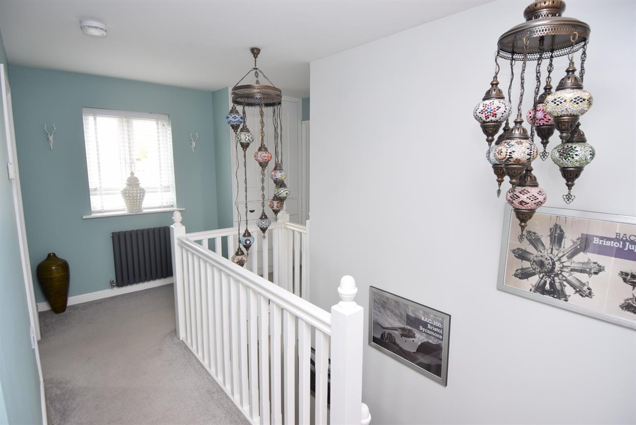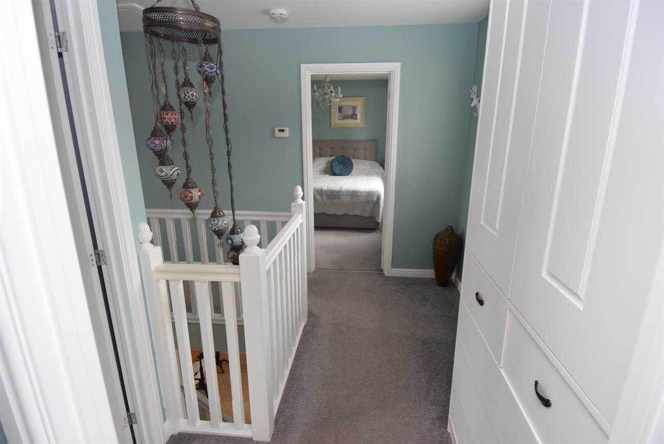 Built in shelved airing cupboard, hatch to loft space, fitted storage cupboard with drawers below, window to the front elevation, radiator.