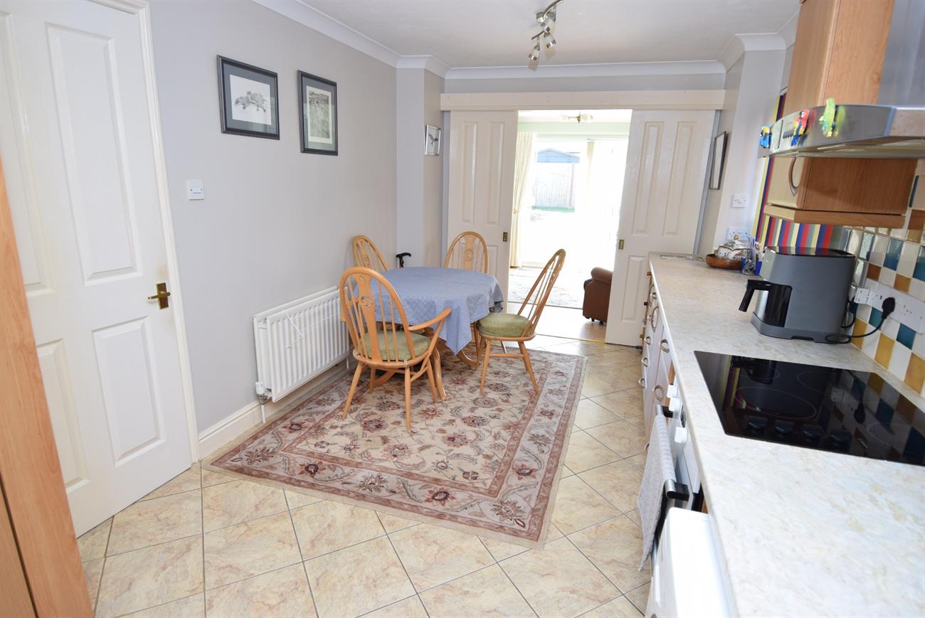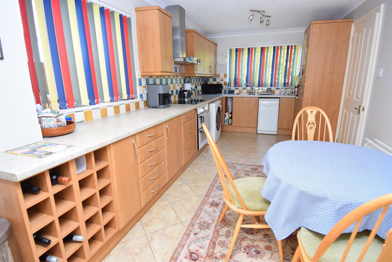 An attractive fitted kitchen offering a range of base, wall and drawer units, preparation work surfaces, one and half bowl stainless sink unit with mixer tap, fitted Bosch electric hob with cooker hood over, built-in double oven and grill, plumbing for both washing machine and dishwasher, window to the front elevation, radiator, window to the side elevation.