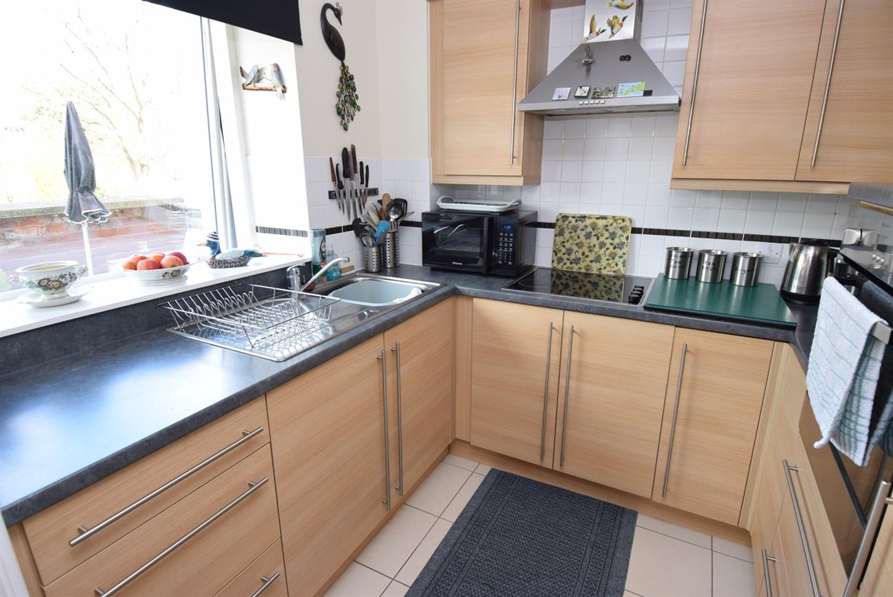 Fitted with a range of base, drawer and wall units, preparation work surfaces, stainless steel sink unit with mixer tap, fitted electric hob with cooker hood over, built-in oven, integrated fridge/freezer, window.