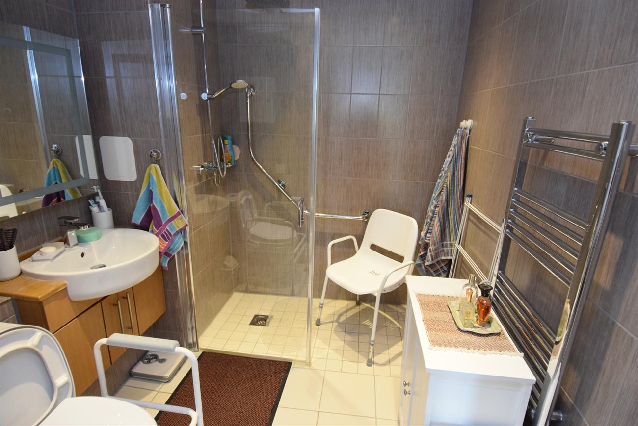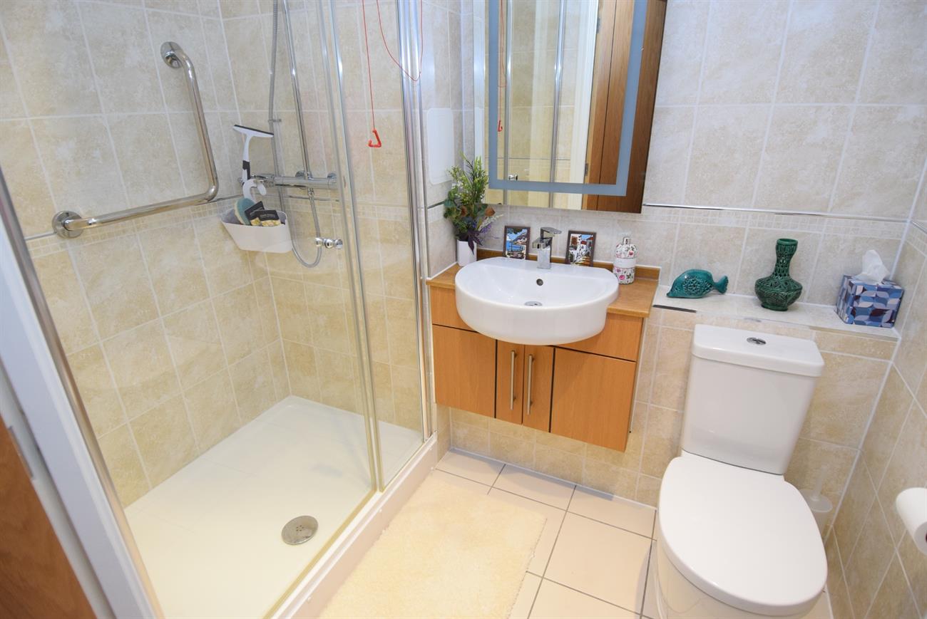Comprising of walk-in shower, wash hand basin set in vanity style sink unit, W.C., ladder rack style towel rail.