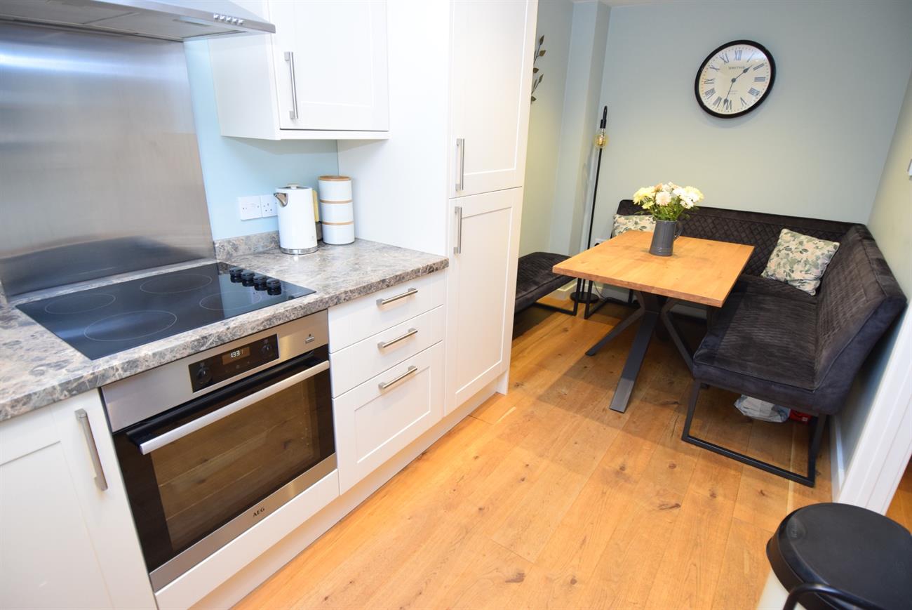An attractive fitted kitchen with a range of wall, base and drawer units, preparation work surfaces with matching upstand, integrated fridge/freezer and washing machine, fitted electric hob with cooker hood over, built-in electric oven, window to the front elevation, under floor heating.