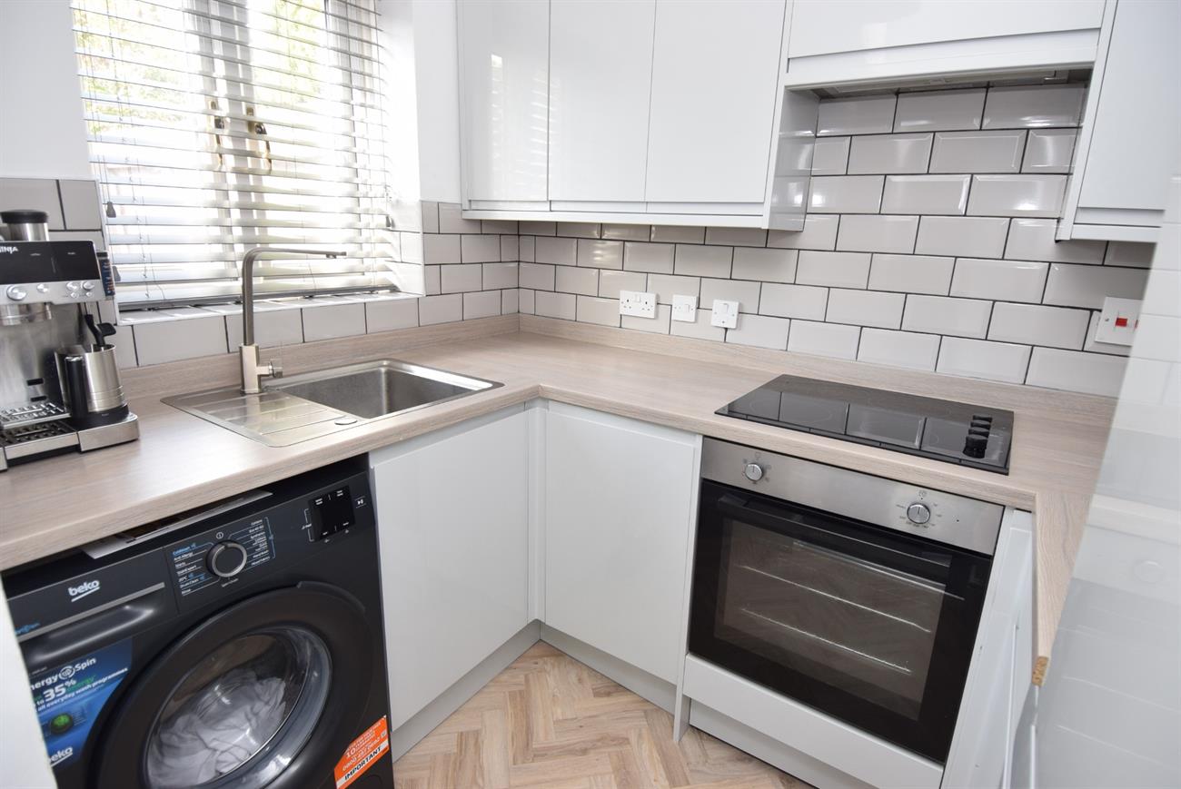 A lovely new fitted kitchen with a range of base and wall units, preparation work surfaces with matching upstands, stainless steel sink unit with mixer tap, oven and hob with cooker hood over, integrated dishwasher and fridge freezer, plumbing for washing machine, window.