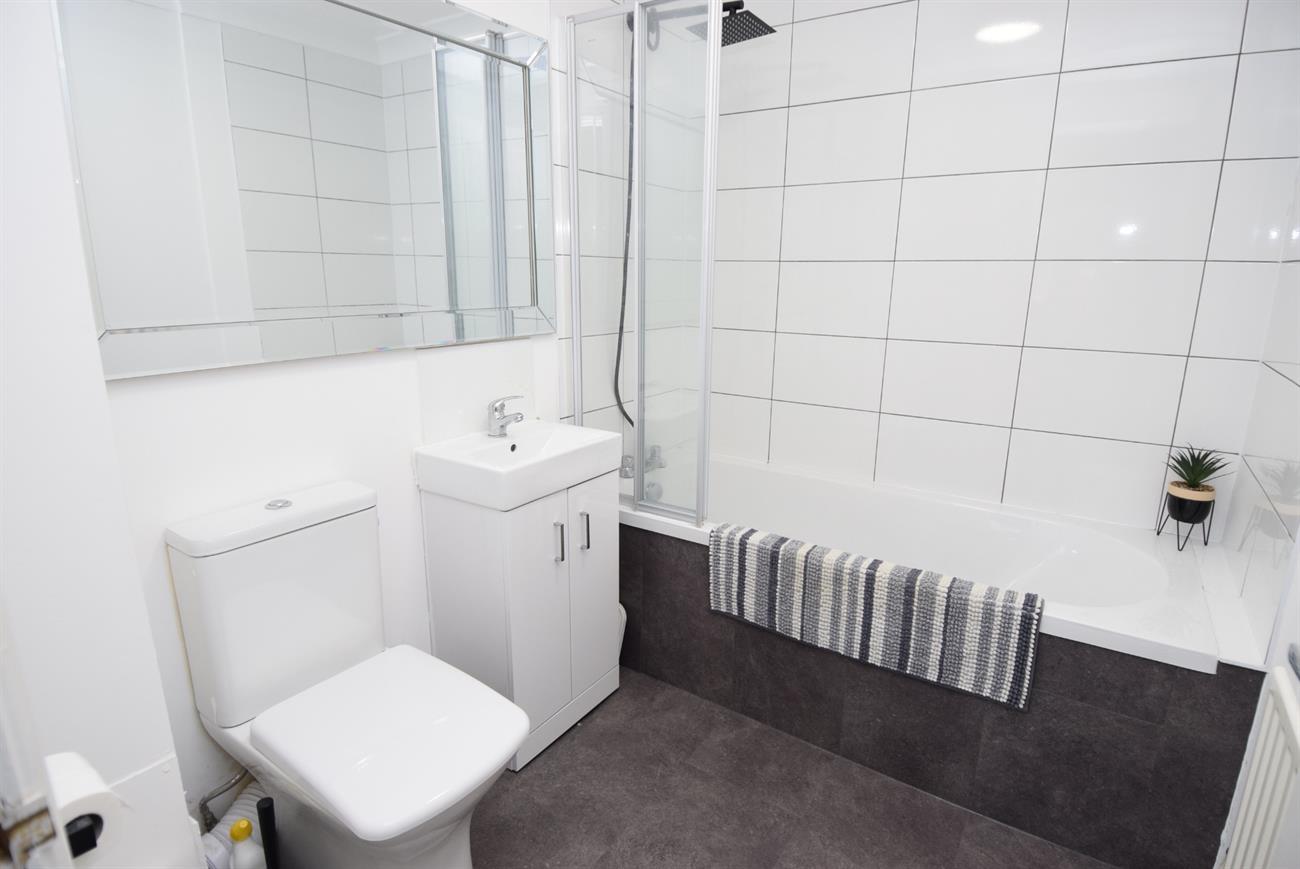 Comprising of bath with mixer tap, shower attachment and screen, wash hand basin set in vanity style unit, W.C., radiator, extractor fan.