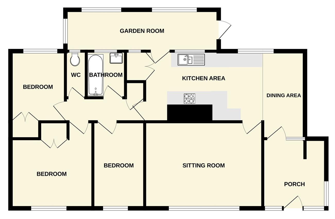 Fitted with a range of base and wall units, preparation work surfaces, stainless steel sink unit with mixer tap, built-in oven and hob, tiled flooring, window to the rear elevation, door giving access to the garden room.