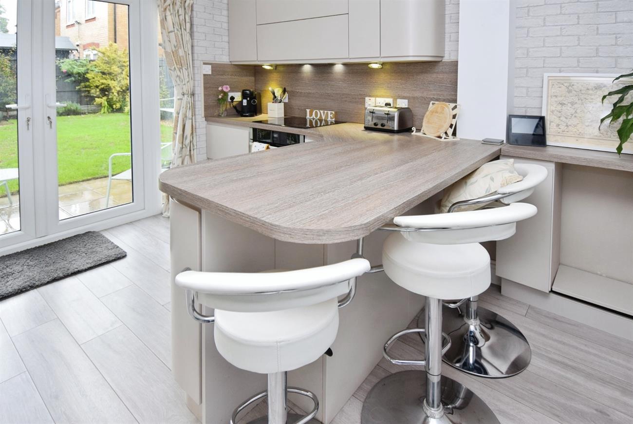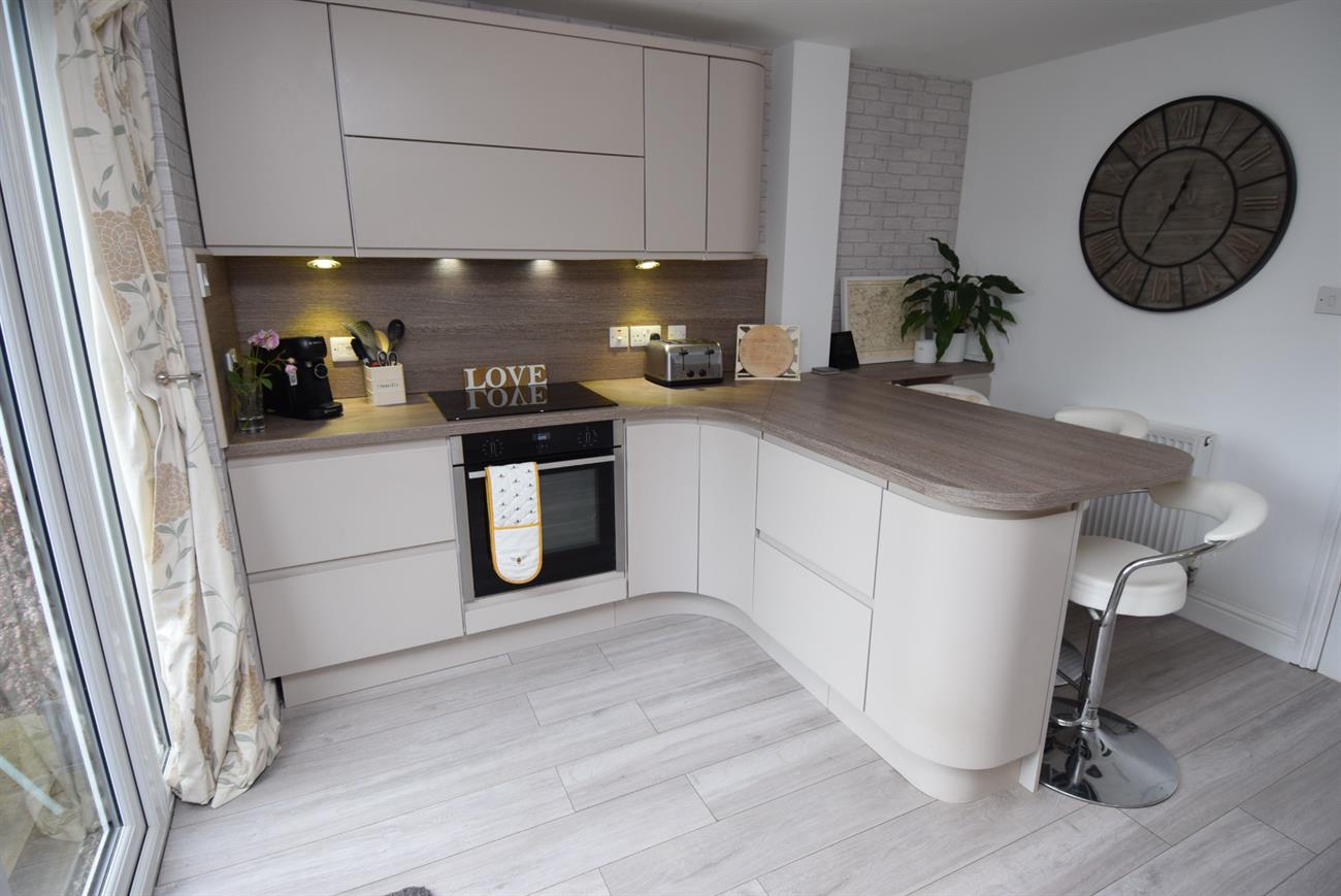 Fitted with a range of base and wall units, preparation work surfaces and breakfast bar, one and half bowl sink unit with mixer tap, Neff oven and induction hob with extractor hood over, integrated Neff dishwasher, plumbing for washing machine, radiator, French doors giving access to the rear garden.